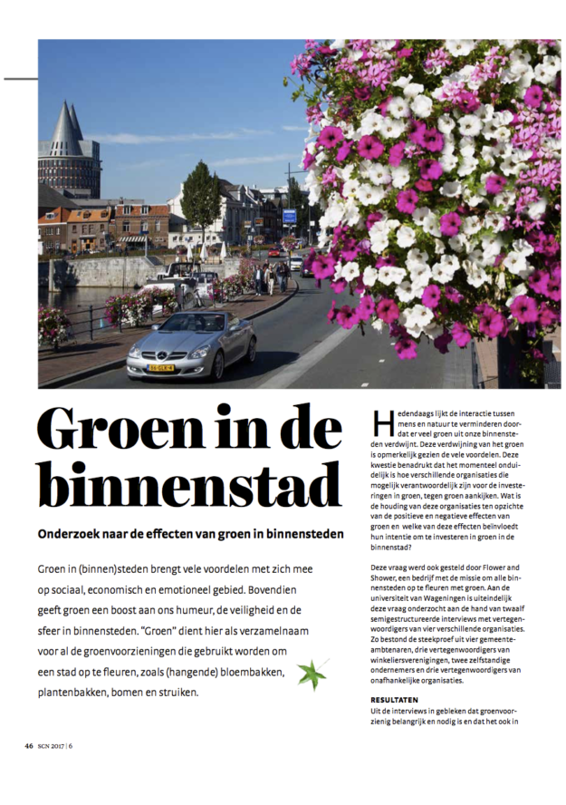 Groen in (binnen)steden brengt vele voordelen met zich mee op sociaal, economisch en emotioneel gebied. Bovendien geeft groen een boost aan ons humeur, de veiligheid en de sfeer in binnensteden. “Groen” dient hier als verzamelnaam voor al de groenvoorzieningen die gebruikt worden om een stad op te fleuren, zoals (hangende) bloembakken, plantenbakken, bomen en struiken.
